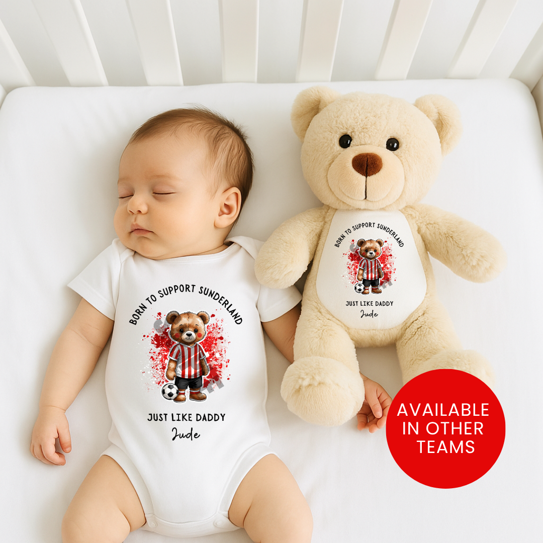 Celebrate your little one’s first team pride with our official-inspired Sunderland baby range — lovingly designed for the tiniest Fans! This exclusive collection features personalised bibs, vests, rompers, and teddy bears, making the perfect gift for new arrivals, baby showers, or proud families. Our soft, 100% cotton vests and rompers are made for comfort and style. Each piece can be personalised with your baby’s name , paired with a bold Sunderland AFC Teddy Bear design. Whether for everyday wear or matchday photo ops, your little fan will look adorable while staying comfy.