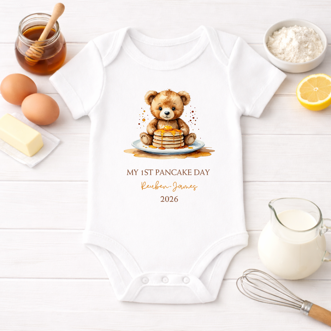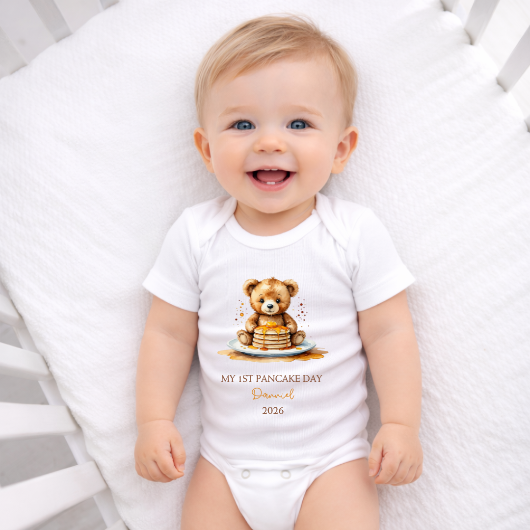 Celebrate a delicious milestone with our “My Very 1st Pancake Day” Personalised Baby Set, designed to make those first memories extra special. Perfect for photos, gifting, and family traditions, this charming set is a keepsake you’ll treasure long after the last pancake is gone. Each item can be personalised with your baby’s name, making it a truly one-of-a-kind outfit for Pancake Day celebrations. Made from 100% cotton, soft, breathable, and gentle on delicate baby skin.