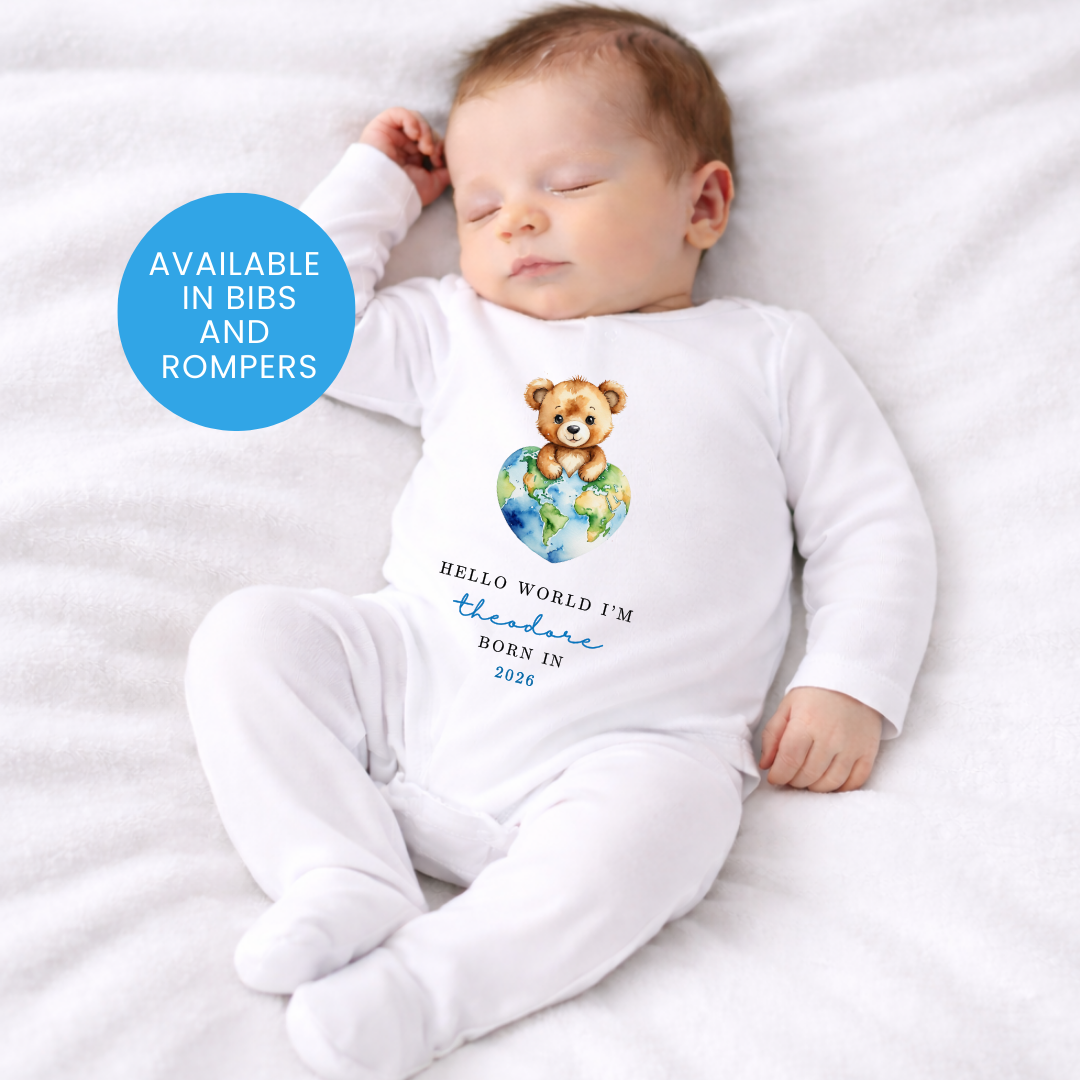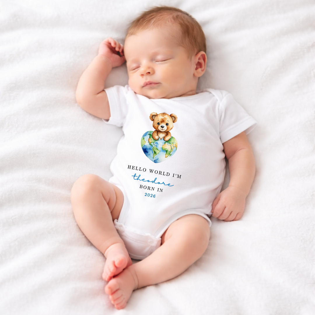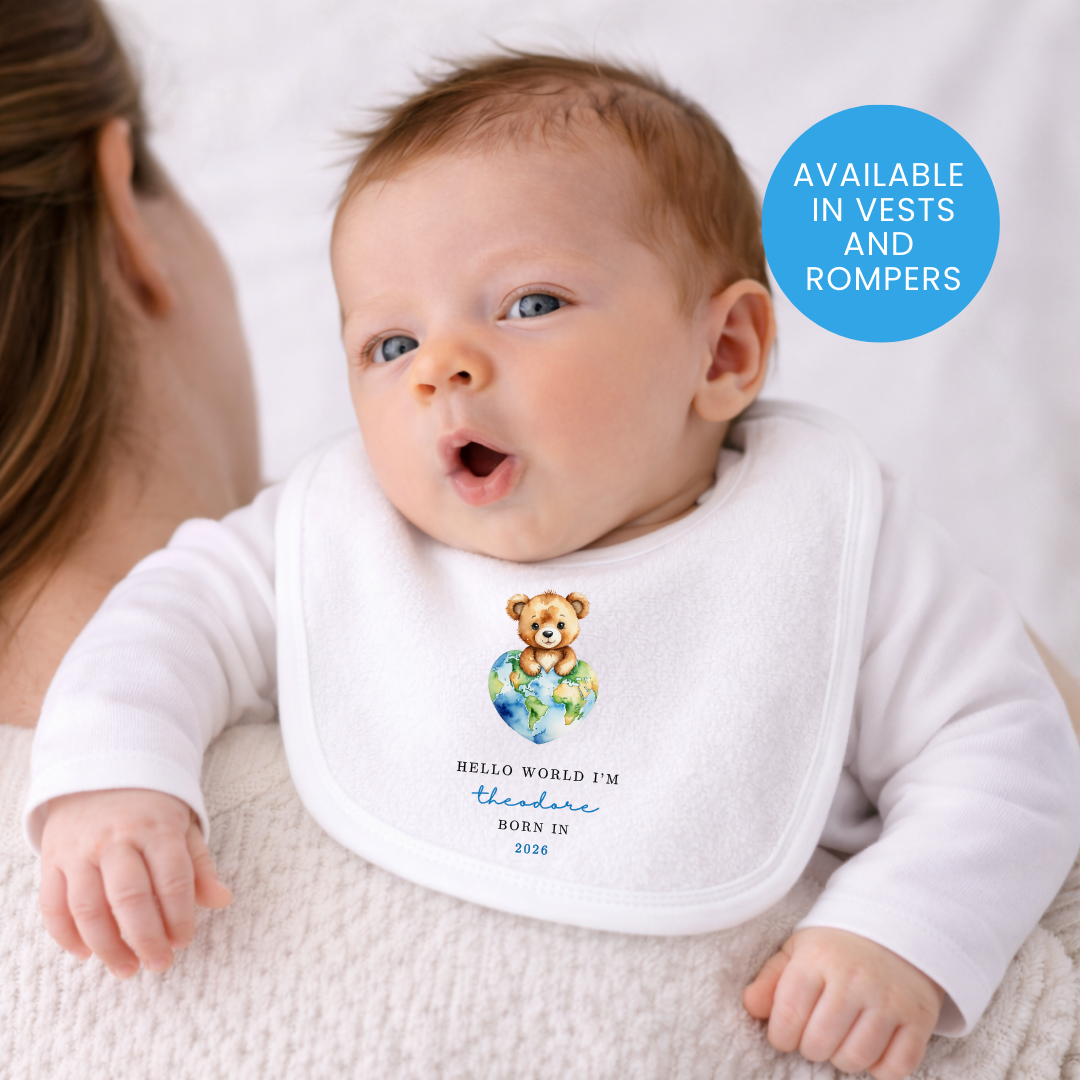 Welcome a little one to the world in the sweetest way with our Hello World Baby Collection, featuring a beautifully illustrated teddy bear cuddling the Earth. Designed to celebrate new beginnings, this timeless design is perfect for newborn announcements, baby showers, and treasured first photos. Each item can be Personalised with the baby’s name and birth year, making it a meaningful keepsake parents will love. Fabric composition: 100% Cotton Soft & comfortable.