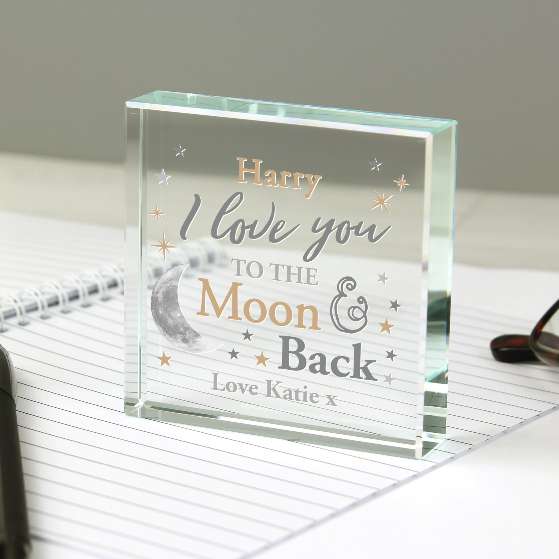 Celebrate love with this beautifully Personalised 'To the moon and back' glass block, a timeless keepsake designed to be treasured forever.