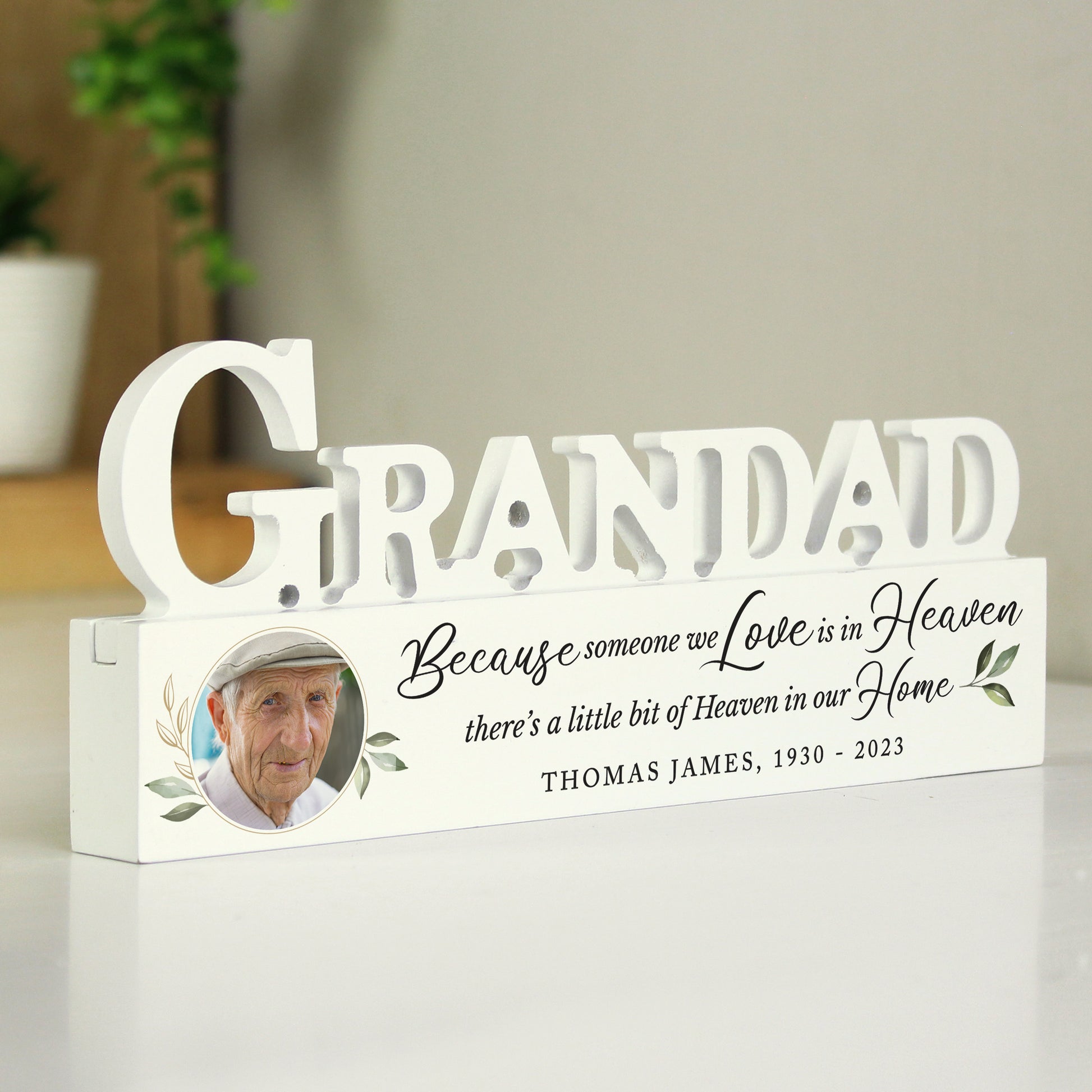 This Personalised Memorial Wooden Grandad Ornament is perfect for remembering a loved one this Fathers Day. This wooden ornament can be personalised with a photo and 1 line of text. The text 'Because someone we Love is in Heaven, there's a little bit of Heaven in our Home' is fixed and cannot be amended.