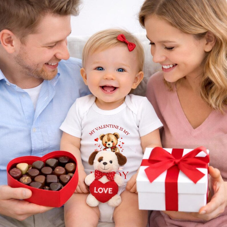 Celebrate baby’s very first Valentine’s Day with this adorable and heart-warming bib, vest or romper. Featuring the sweet message “My Valentine Is Daddy”, it’s a perfect way to capture a precious moment and show just how special Dad is.