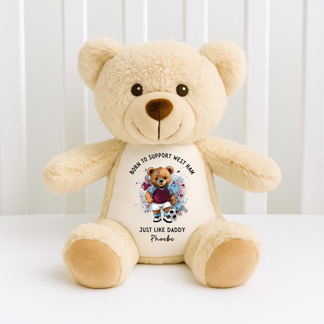 Celebrate your little one’s first team pride with our inspired West Ham baby range — lovingly designed for the tiniest Hammers! This exclusive collection features personalised bibs, vests, rompers, and teddy bears, making the perfect gift for new arrivals, baby showers, or proud families. Our soft, 100% cotton vests and rompers are made for comfort and style. Each piece can be personalised with your baby’s name , paired with a bold West Ham Teddy Bear design. Whether for everyday wear or matchday photo ops, your little fan will look adorable while staying comfy.