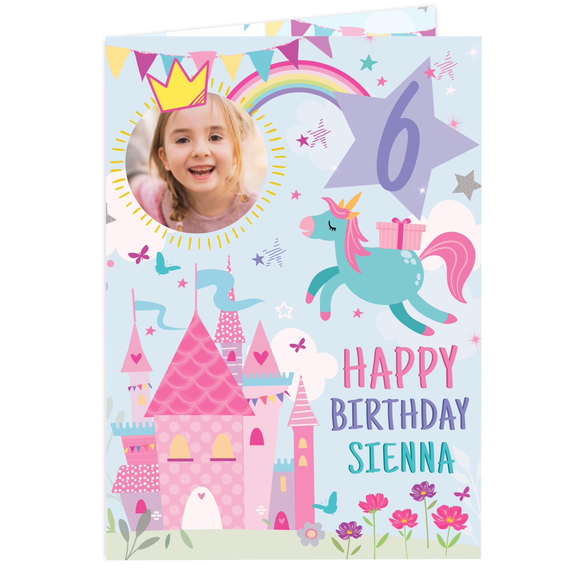 Make her birthday magical with our enchanting Personalised Princess Photo Upload Birthday Card! Featuring a whimsical castle in a dreamy pastel wonderland, this card is perfect for little royals who believe in unicorns and birthday wishes.