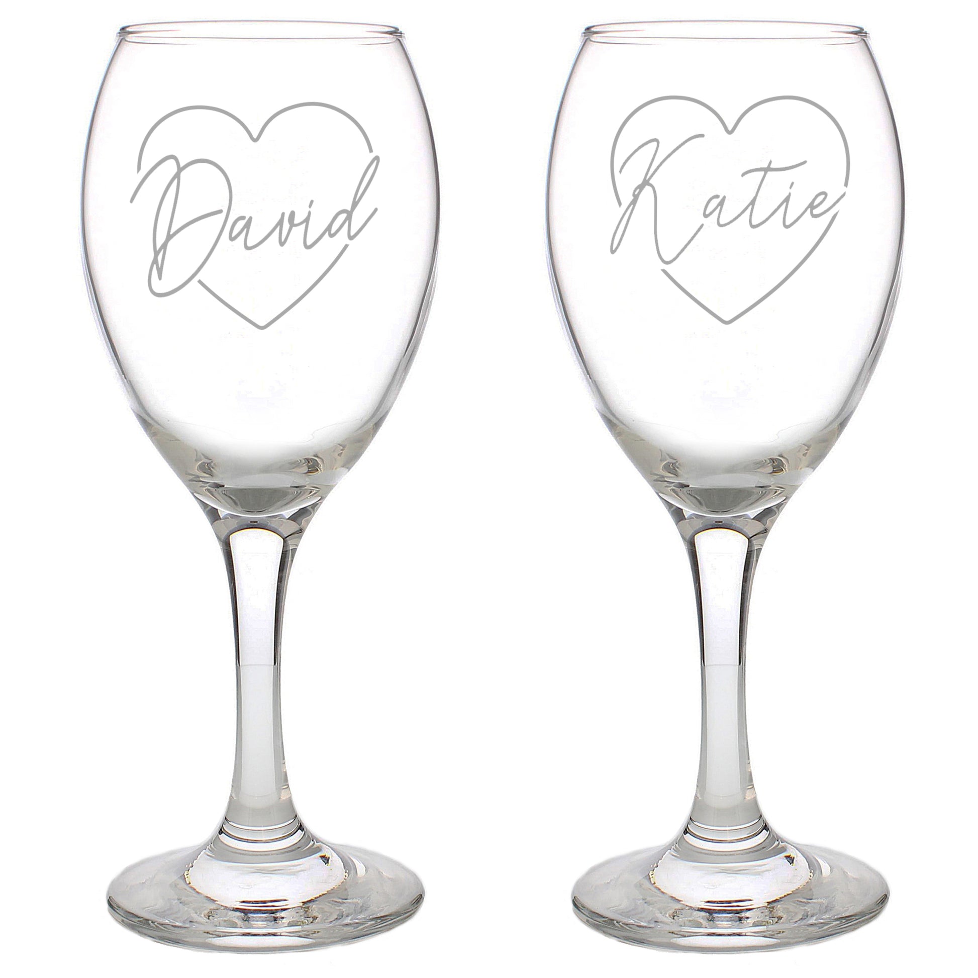 Celebrate love, milestones, and everyday moments with this Personalised Couple Wine Glass Set — a timeless keepsake designed for two hearts to toast as one. Crafted from clear, high-quality glass, each wine glass features an elegant heart outline paired with a beautifully scripted name, creating a romantic and meaningful design. The delicate engraving adds a personal touch while maintaining a modern, minimalist aesthetic that complements any table setting.